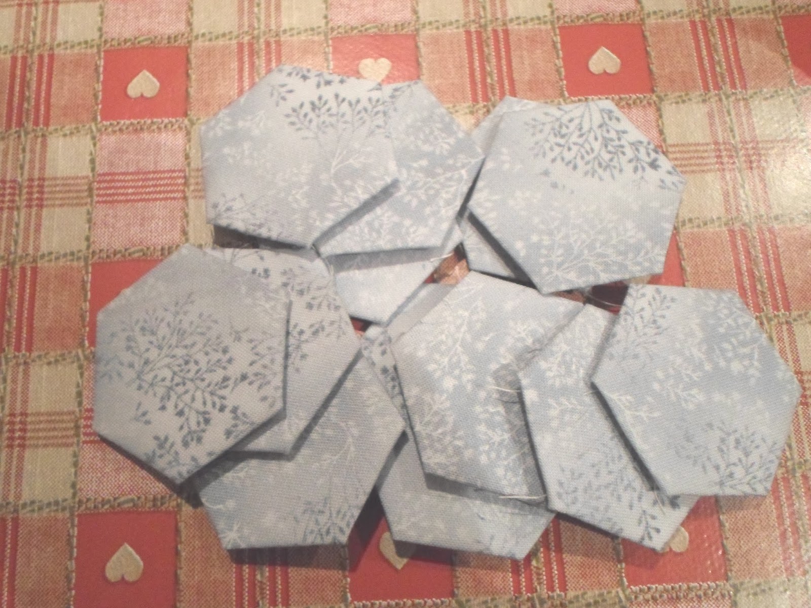 I am getting a nice collection of blue flowers now and am starting to think about a colour for the setting hexies - at the moment I am thinking a nice, sunny, golden yellow but that could change.